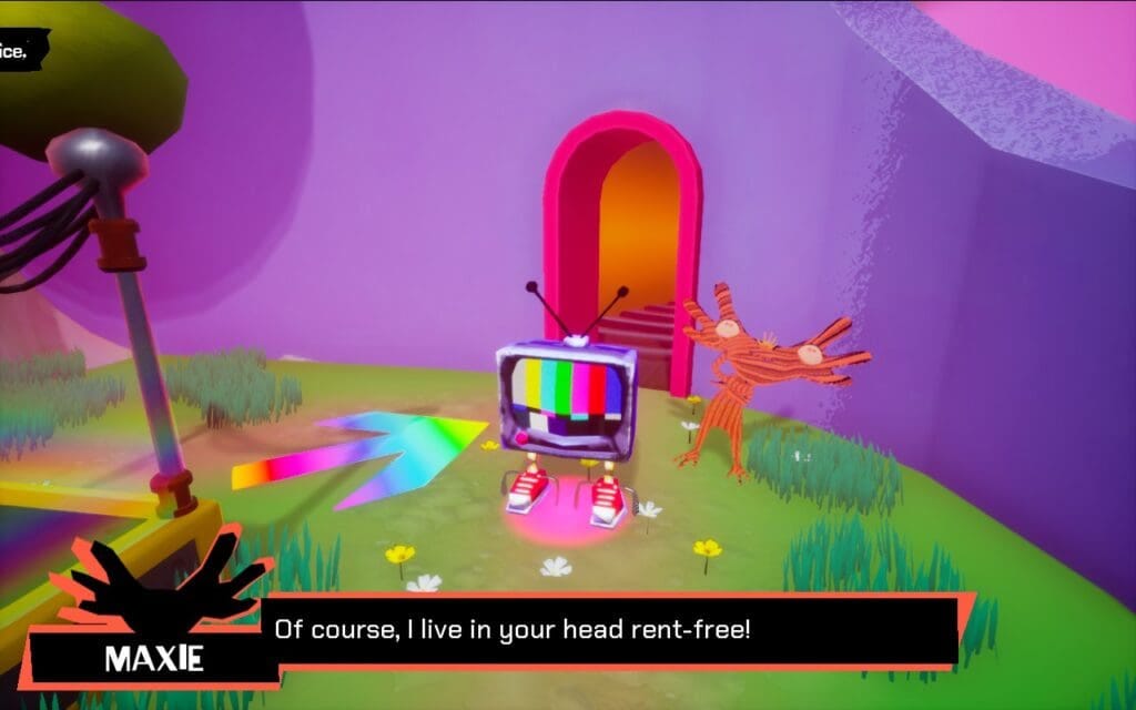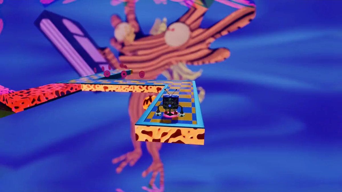 The bulk of the action involves Tee Vee collecting CDs and compact discs as you progress up, down, and under its 3-D obstacle courses. Tee Vee’s character design is blocky and intentionally surreal, and it all comes together in some fun, if oddball N-64-inspired glory. You’ll begin the game able to do just basic movements like running nd jumping. Very early on in the 4-hour-ish campaign, Tee Vee will unlock a jet pack, allowing him to do a dash. Other upgrades will follow.